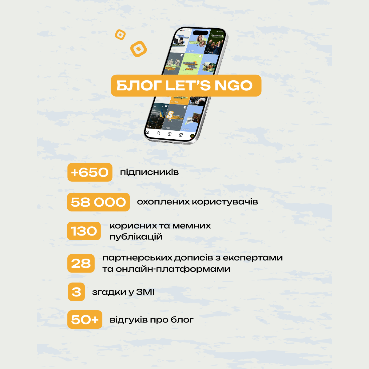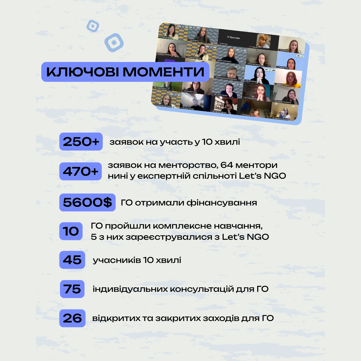 Упродовж року Let’s NGO став простором для молодих активістів, які робили перші кроки до створення громадських організацій. Учасники формували команди, напрацьовували управлінські та комунікаційні навички, вчилися працювати зі спільнотами та втілювати соціальні ідеї у практичні дії.