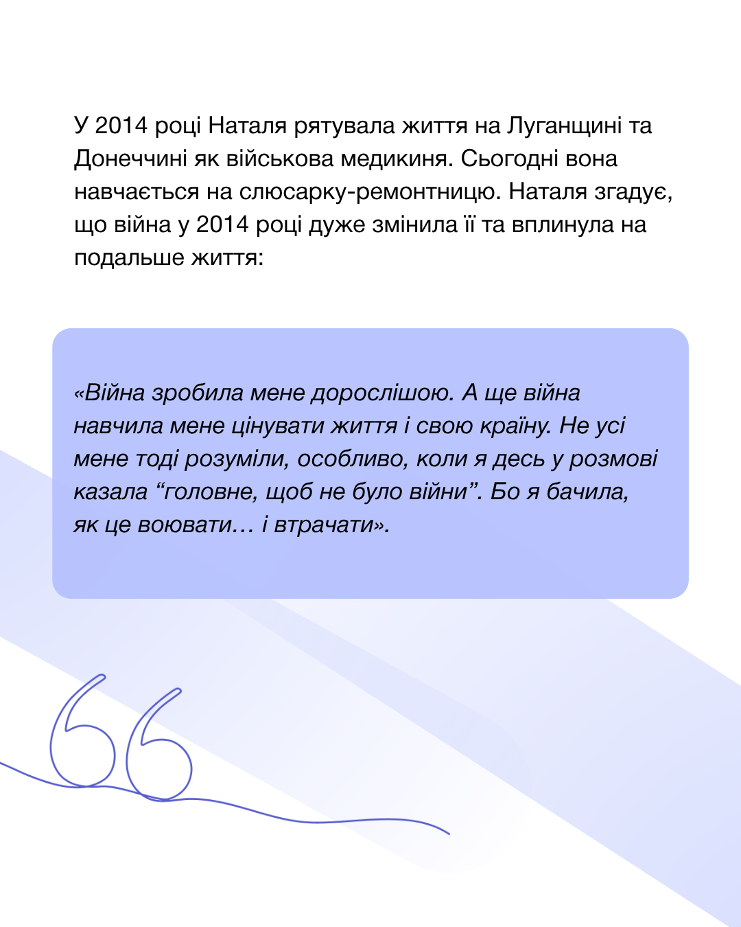 У 2014 році Наталя Нітішевська рятувала життя на Луганщині та Донеччині як військова медикиня. Сьогодні вона знову навчається – цього разу, щоб опанувати фах слюсарки-ремонтниці.