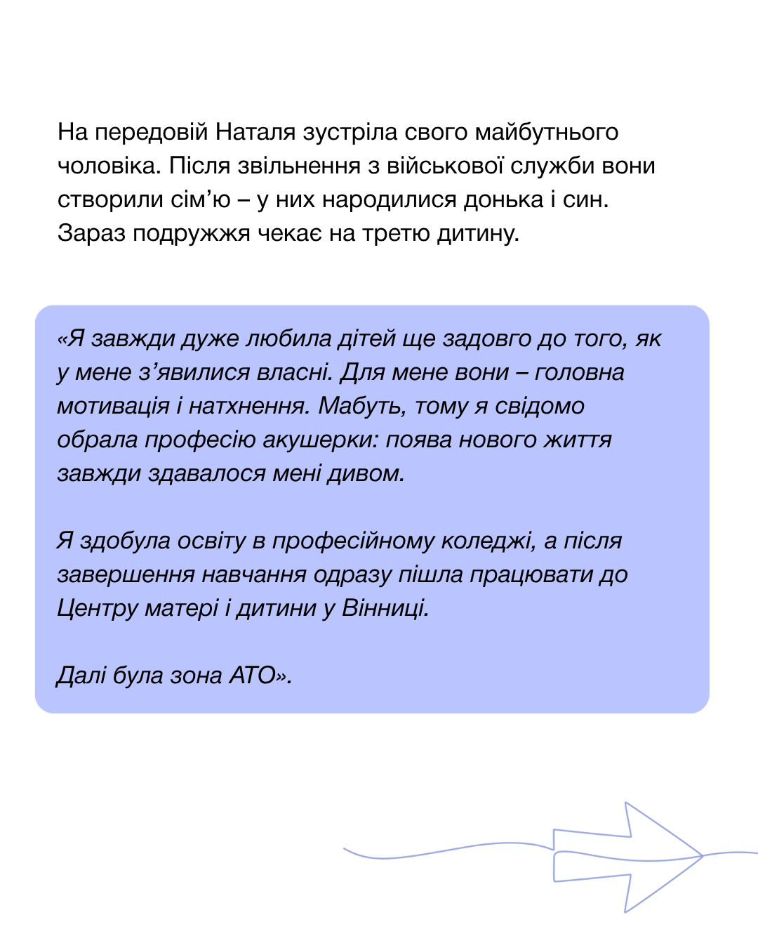 Наталі 30 років. Вона з Вінниці, ветеранка, мама двох дітей, і зараз разом із чоловіком чекає на третю дитину. Після звільнення з військової служби для Наталі важливо не просто будувати цивільне життя, а мати опору, впевненість і практичні навички, що допомагають у щоденних викликах.