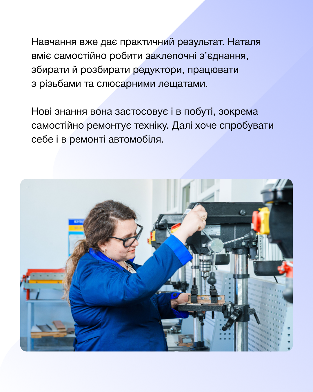 Участь у проєкті вже дає Наталі практичний результат. Вона вміє самостійно робити заклепочні з’єднання, збирати й розбирати редуктори, працювати з різьбами та слюсарними лещатами.