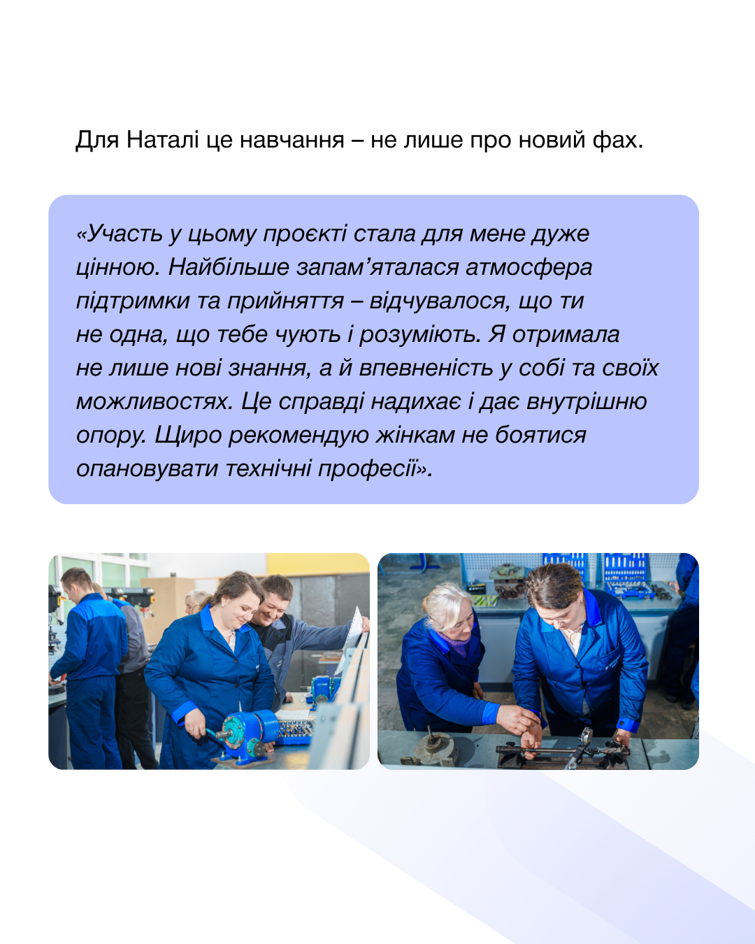Я отримала не лише нові знання, а й впевненість у собі та своїх можливостях. Цей досвід справді надихає і дає внутрішню опору. Щиро рекомендую жінкам не боятися опановувати технічні професії».