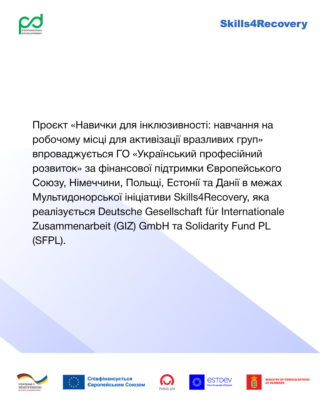Проєкт «Навички для інклюзивності: навчання на робочому місці для активізації вразливих груп» впроваджується ГО «Український професійний розвиток» за фінансової підтримки Європейського Союзу, Німеччини, Польщі, Естонії та Данії в межах Мультидонорської ініціативи Skills4Recovery, яка реалізується Deutsche Gesellschaft für Internationale Zusammenarbeit (GIZ) GmbH та Solidarity Fund PL (SFPL).